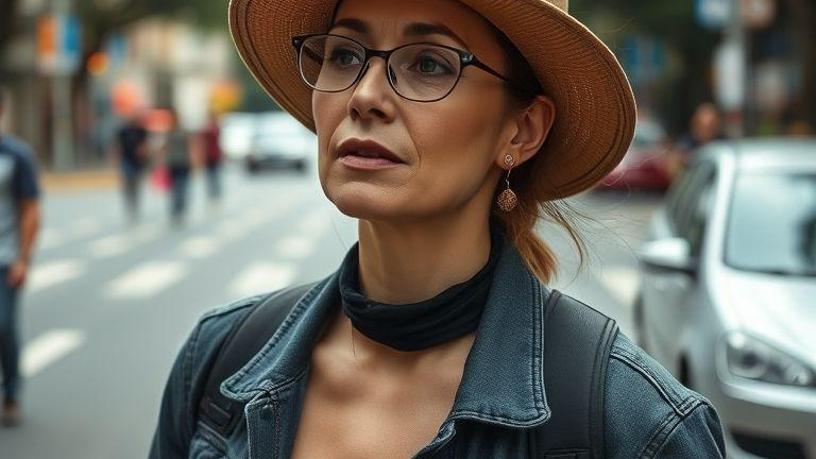 A imagem mostra Maria, com cerca de 30 anos, caminhando lentamente pela calçada, com a cabeça baixa e os olhos fechados. Ela parece estar completamente absorvida pelo seu próprio pensamento, sem se preocupar com o que está ao seu redor. A cena é tão inesperada que até mesmo os transeuntes passavam por perto, sem notar a mulher falando sozinha.